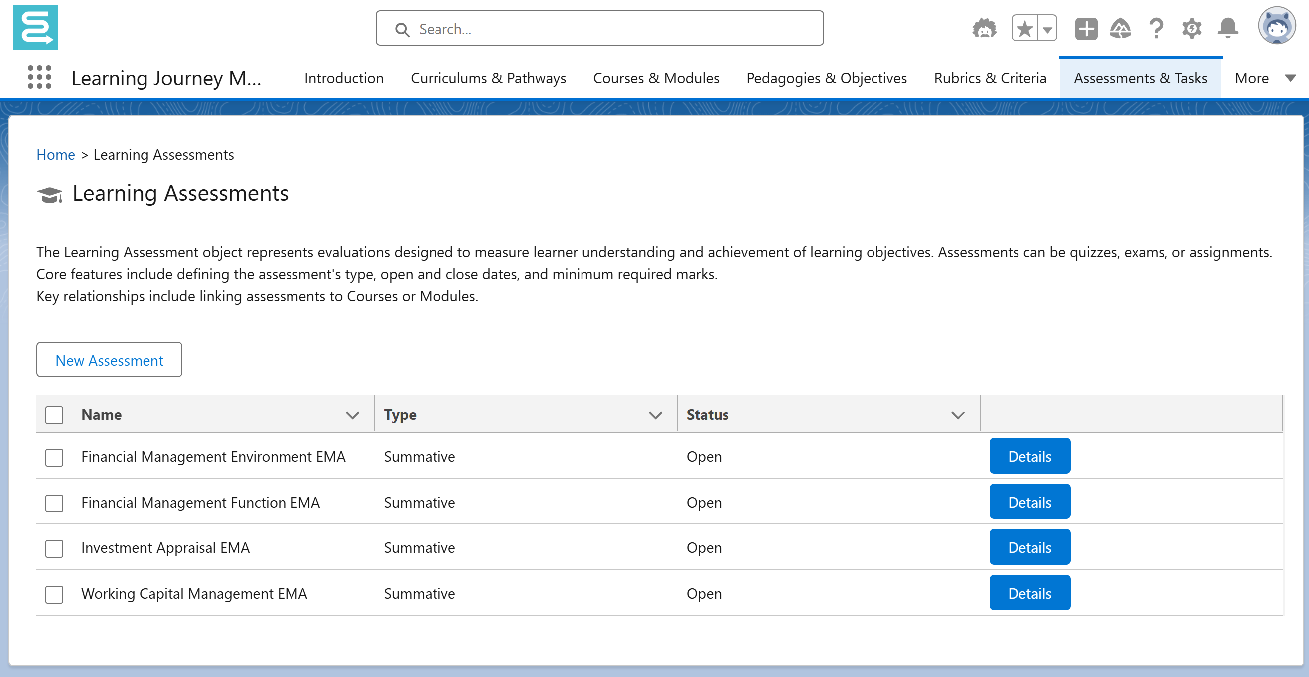 - From the Assessment Details page, locate the related Learning Text Tasks list.