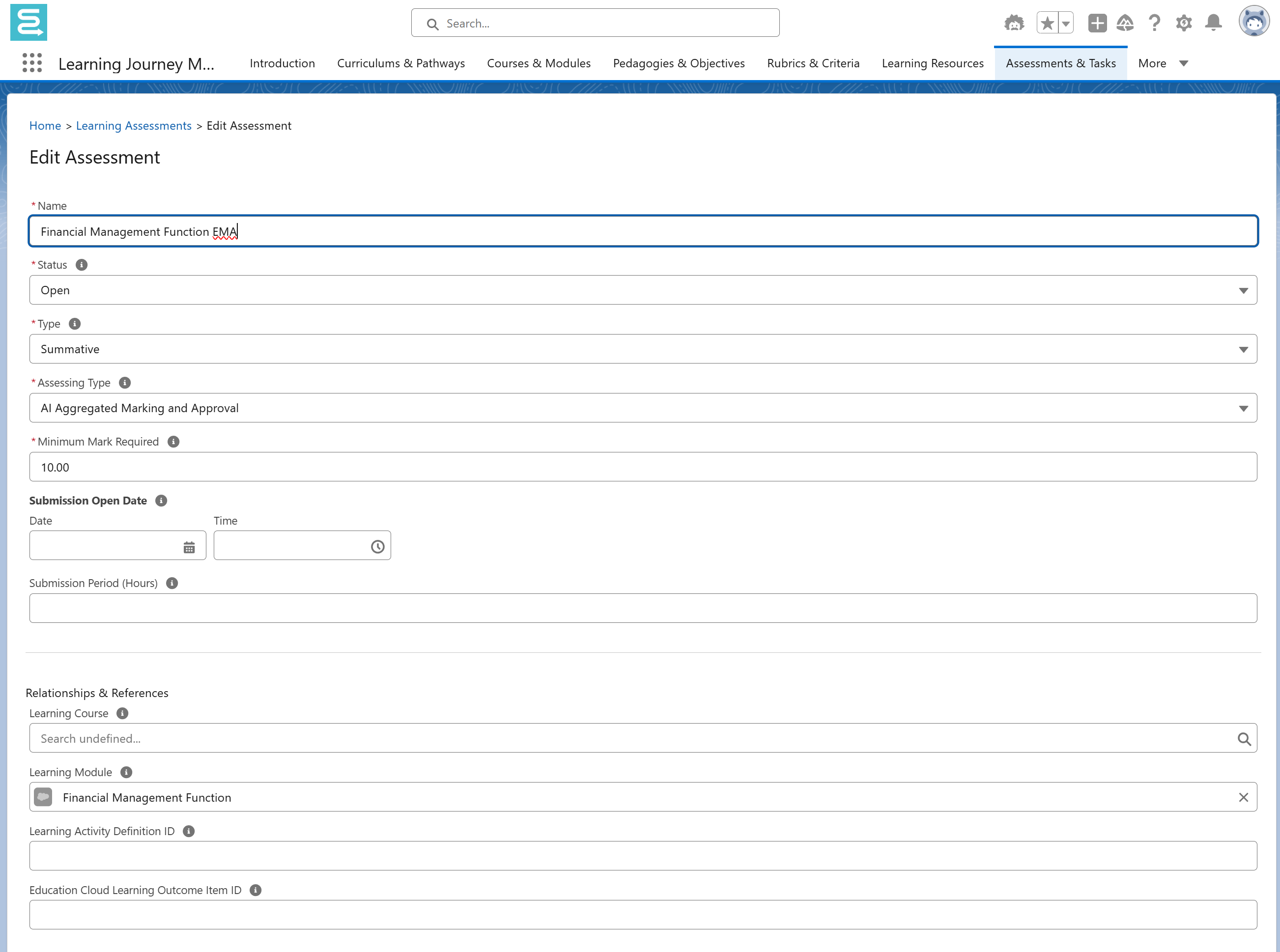- Education Cloud Learning Outcome Item ID: (Optional) Associate assessment with an Education Cloud reference if required.