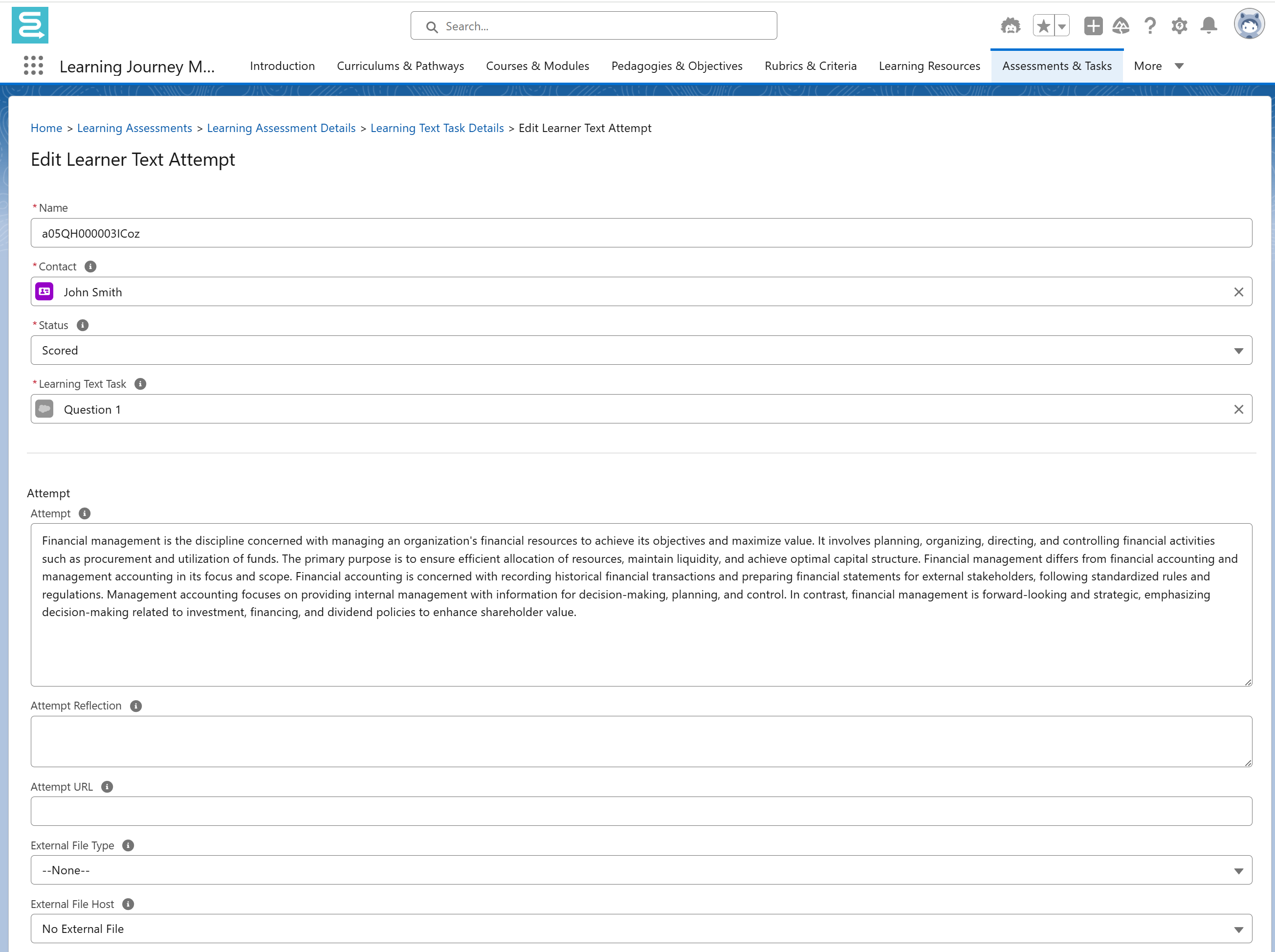 - Learning Text Task: Associate the learner text attempt with a learning text task.