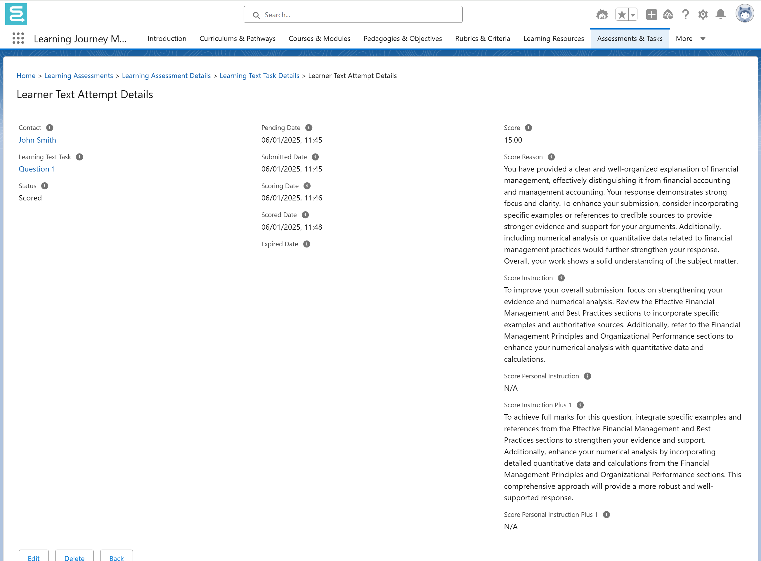 - Score Personal Instruction: (Optional) Personalized instructions or feedback for the learner.