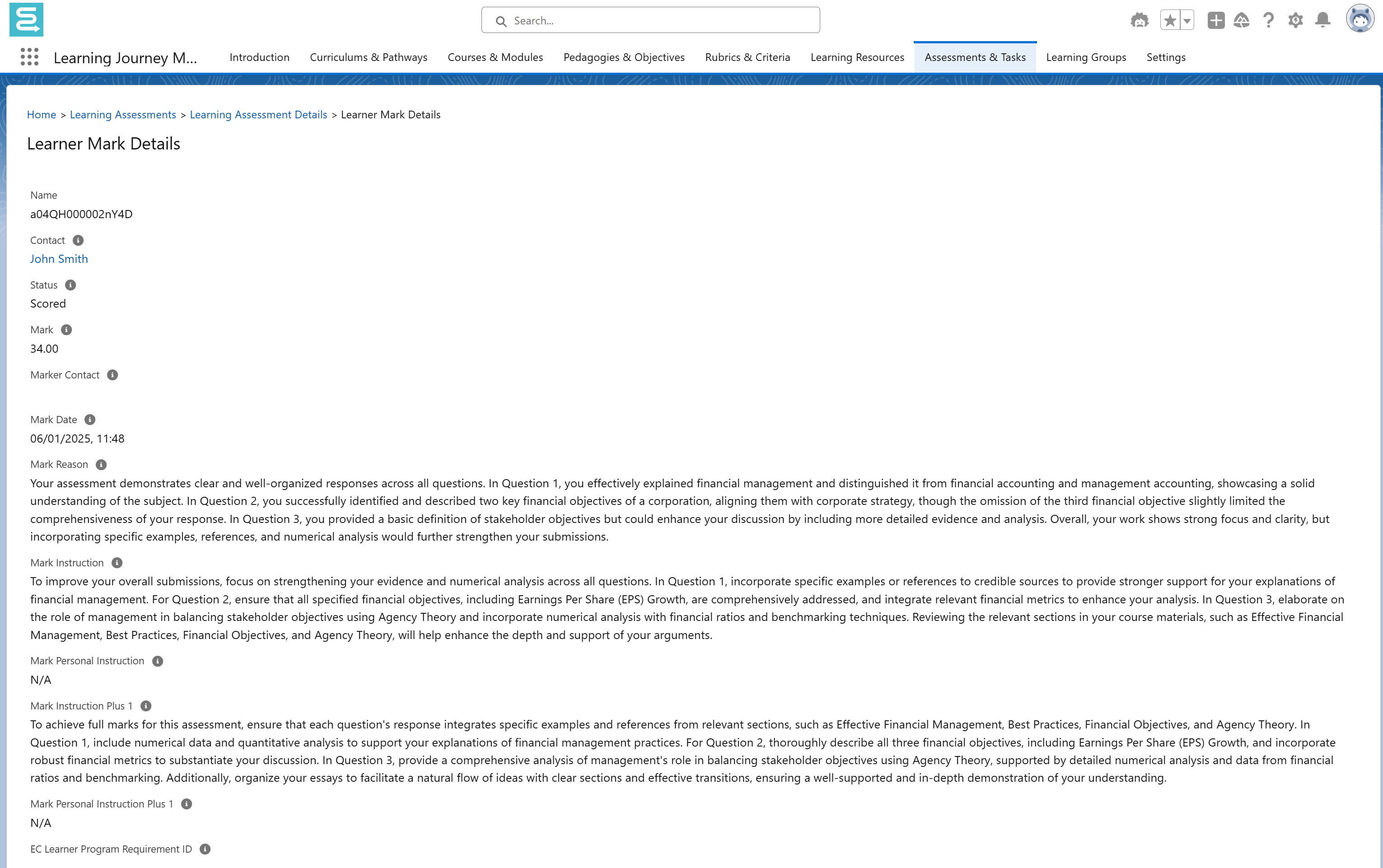 - Mark: The final mark or score assigned to the learner.