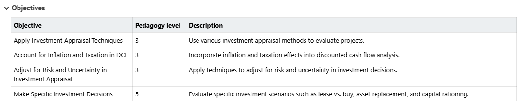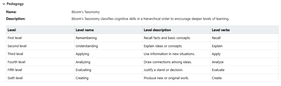 Shows Pedagogy name and description and level information.