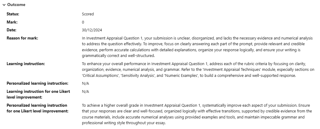 This will be blank until an assessment has been submitted, after which it will show the Outcome summary.